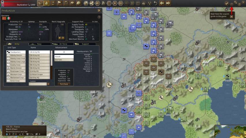 L’unico punto a sfavore dell’interfaccia, è la gestione delle nuove unità. Ad inizio gioco, e soprattutto nella sua fase avanzata, la produzione di nuove divisioni sarà uno degli elementi cardine ai fini della vittoria. Il problema, è che nel mezzo della battaglia, se stai producendo molte unità, ti ritroverai con una coda lunghissima perché il pulsante “spiegamento” ti permette di far scendere sulla mappa tattica una singola unità per volta.