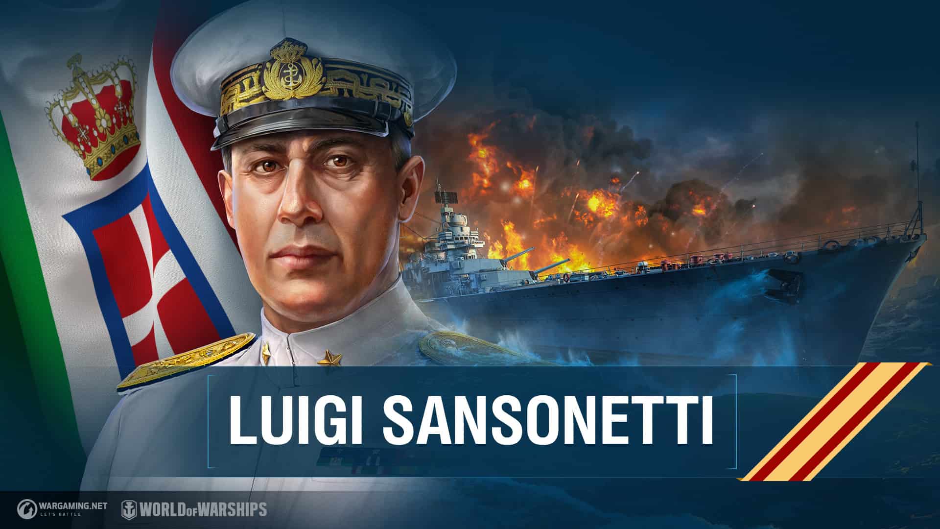 Completando la collezione, verrà sbloccato lo storico comandante della Marina italiana Luigi Sansonetti, dotato di potenti abilità speciali da sfruttare nel gioco. I suoi talenti si attivano raggiungendo specifici obiettivi in battaglia: distruggere una nave nemica, per esempio, aumenta la gittata massima delle batterie di armi principali. Questo comandante vanta anche due abilità potenziate: Servente esperto e Accelerazione siluri. Come altri comandanti storici unici, l’italiano dispone di una personalizzazione speciale: un guidone del capitano, traccianti dei proiettili colorati e un razzo di segnalazione che viene lanciato al di sopra della nave quando si attiva uno dei suoi talenti.