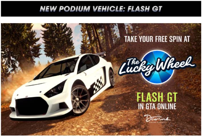 Questa settimana il primo premio della ruota fortunata è una Vapid Flash GT, un’auto sportiva progettata per andare a fare la spesa ma anche per sterzare e affrontare i più grintosi rally fuoristrada. Fai un salto nell’atrio del Casinò e Resort Diamond e fai il tuo giro quotidiano alla ruota per provare a vincere quest’auto sportiva oltre a GTA$, RP, abbigliamento e molto altro.
