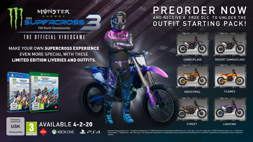 Monster Energy Supercross – The Official Videogame 3 presenterà la stagione 2019 dell’omonima serie con 100 piloti delle classi 450SX e 250SX e 15 stadi ufficiali. Per la prima volta nella serie, il titolo consentirà ai giocatori di scegliere anche tra una squadra sponsor o una squadra ufficiale di Supercross del campionato 2019 all’interno della Career Mode.