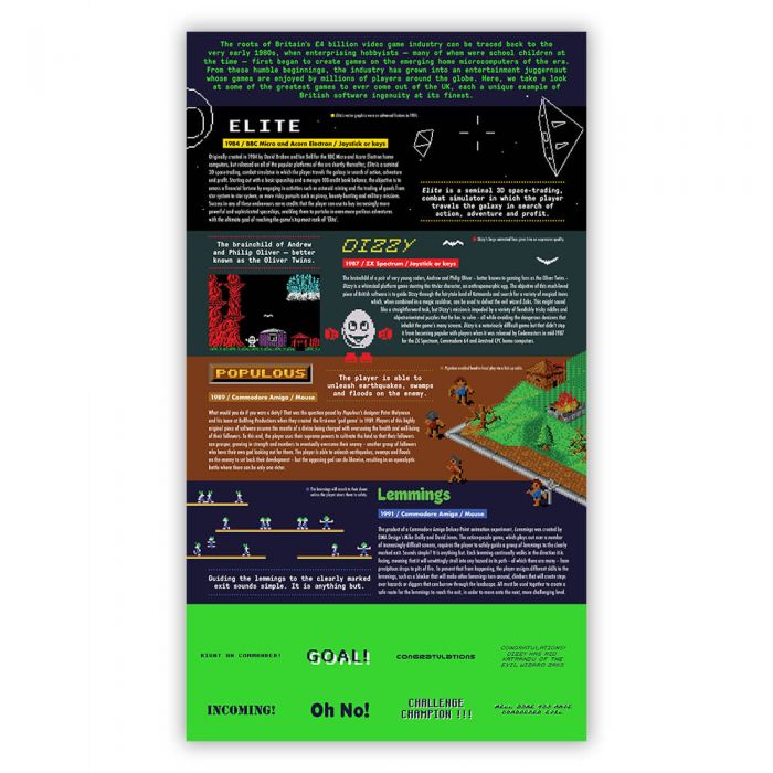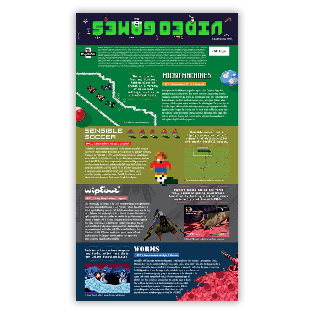 Le Poste britanniche sono autrici di questa iniziativa filatelica. Tra i titoli immortalati nei francobolli troviamo Tomb Raider (1996), Tomb Raider III: Adventures of Lara Croft (1998), Tomb Raider Chronicles (2000), più il reboot del 2013 fanno parte di una mini-serie a parte, con Elite (1984), Dizzy (1987), Populous (1989), Lemmings (1992), Micro Machines (1991), Sensible Soccer (1992), WipeOut (1995), e Worms (1995) a concludere il resto di questa raccolta.