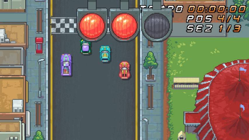 Ne è nato un gioco che offre una modalità Storia interessante. Non troppo per la trama ma per come si sviluppa. Il nostro protagonista deve salvare suo fratello minore da una banda di criminali. Per farlo deve vincere più di una sessantina di gare. Non troppo lunghe ma decisamente intense. Potrà così raccogliere crediti per potenziare la sua vettura. Colpisce l’ottima grafica in pixel art con visuale dall’alto ricca di tanti dettagli ed orpelli grafici ma anche concreti come le diverse reazioni della vettura in diverse superfici.