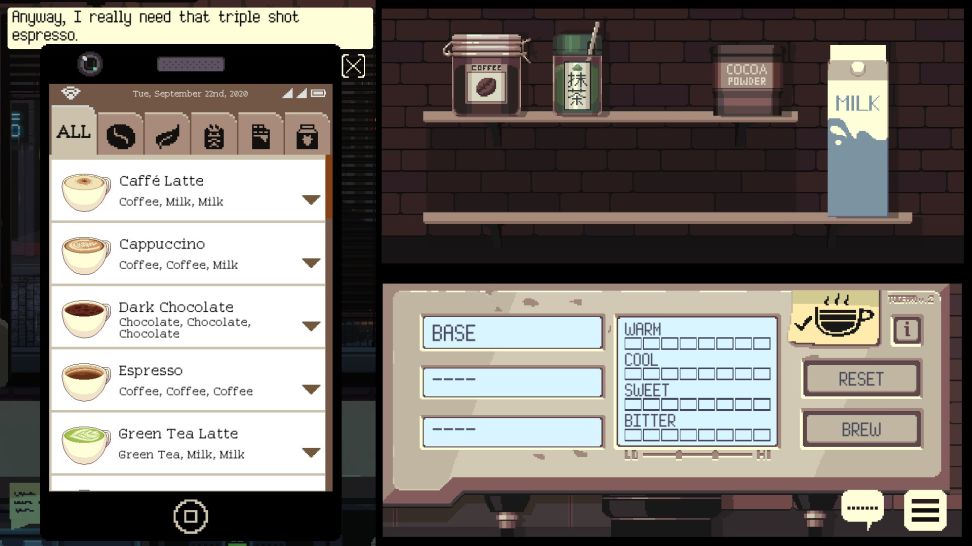 • Brewpad – Un elenco che raccoglie tutte le ricette delle bevande che è possibile creare. Alcune sono disponibili da subito, ma la maggior parte di esse va scoperta durante il gioco, tramite indicazioni dei clienti o facendo esperimenti. La bevanda che si può creare è frutto di una combinazione di tre ingredienti, che possono essere miscelati in varie misure per creare la bevanda perfetta per il cliente (o la sua ordinazione) del momento.