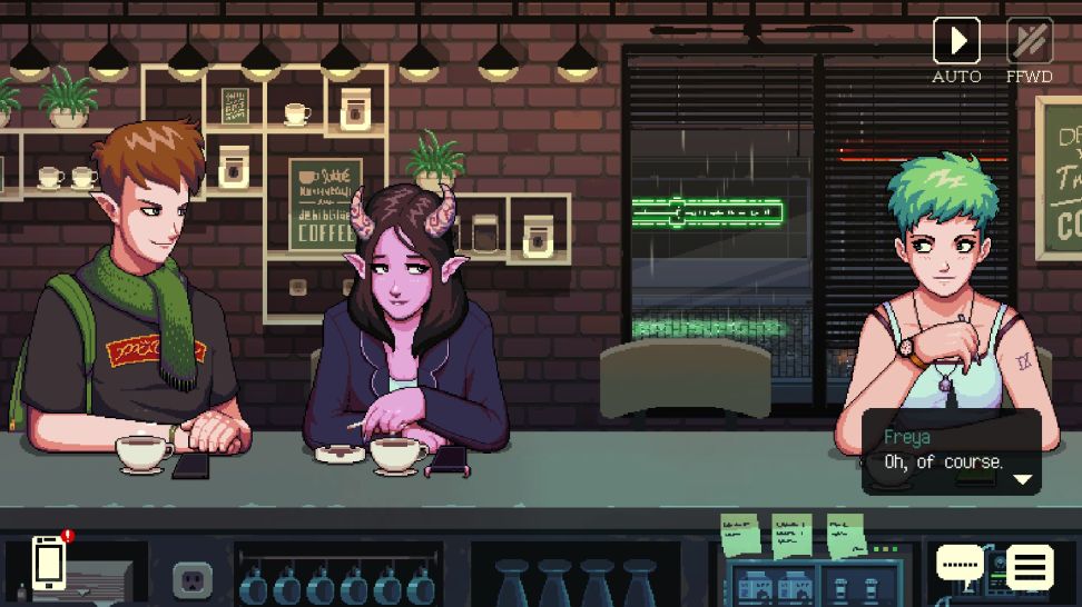 Prima fra tutte Freya, la giovane scrittrice amica e cliente fissa del barista che tra un espresso e l’altro è la prima a prendere parte alle conversazioni, nell’atto di proporre al giocatore storie di vita e vicende che sì, riguardano un mondo fantasy, ma raccontano e trattano in maniera leggera e rilassante tante tematiche e problemi del nostro tempo. Come la vicenda dell’elfo Baileys e della succubus Lua, una coppia messa in crisi dall’ostilità delle rispettive famiglie circa l’unione con un esponente di una razza diversa.