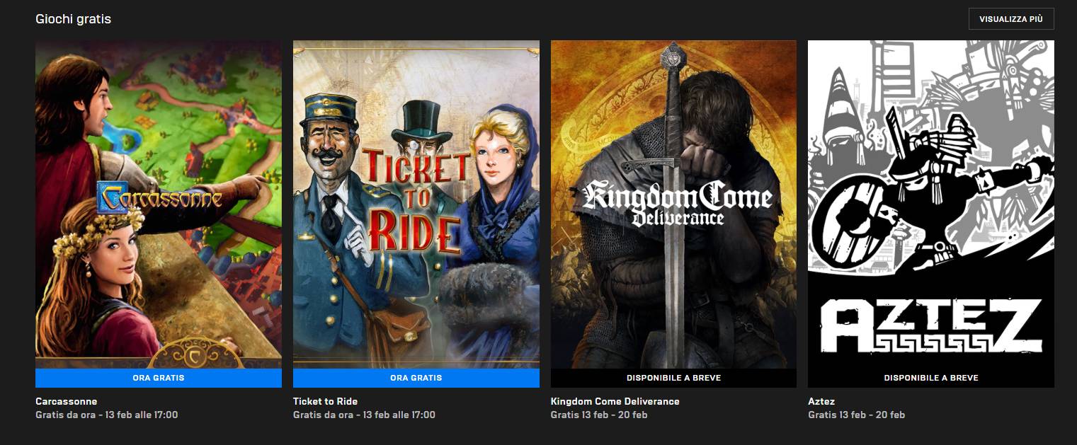 Disponibili da ora Carcassone e Ticket to Ride, versioni digitali di famosi giochi da tavolo. Poi, dal 13 al 20 febbraio si potrà riscattare gratuitamente Kingdom Come Deliverance. Uno dei Gdr open-world più importanti degli ultimi anni ad ambientazione medievale con un’avventura epica nel Sacro Romano Impero. Ed infine, dal 20 febbraio Aztez, un gioco unico che unisce il genere picchiaduro a quello di strategia a turni, il tutto ambientato nel mondo dell’Impero azteco.