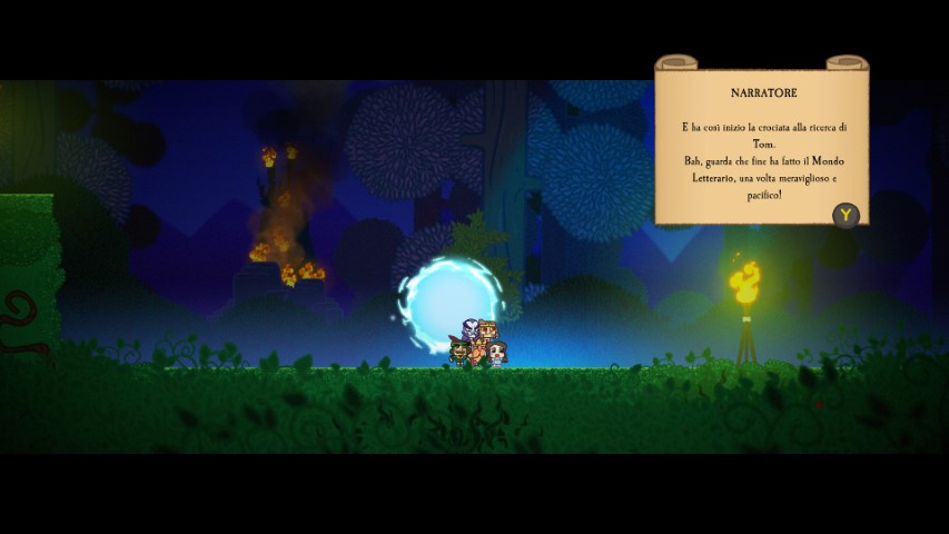 Ciò che colpisce a primo acchito è lo stile artistico di Bookbound Brigade. L’aspetto grafico molto caratteristico è veramente ben fatto sia per design che per stile. La caratterizzazione dei personaggi è deliziosa così come quella dell’ambiente. Si tratta di un gioco a scorrimento in 2d veramente ben disegnato ed animato con tante finezze come il muoversi delle fronde degli alberi, gli uccellini che svolazzano via da terra ad un nostro passaggio e così via. Nonché – come già accennato – le movenze delle varie formazioni della nostra brigata (non Brancaleone per fortuna) che in certe superfici o a certa velocità tendono anche a scivolare o a bilanciarsi.