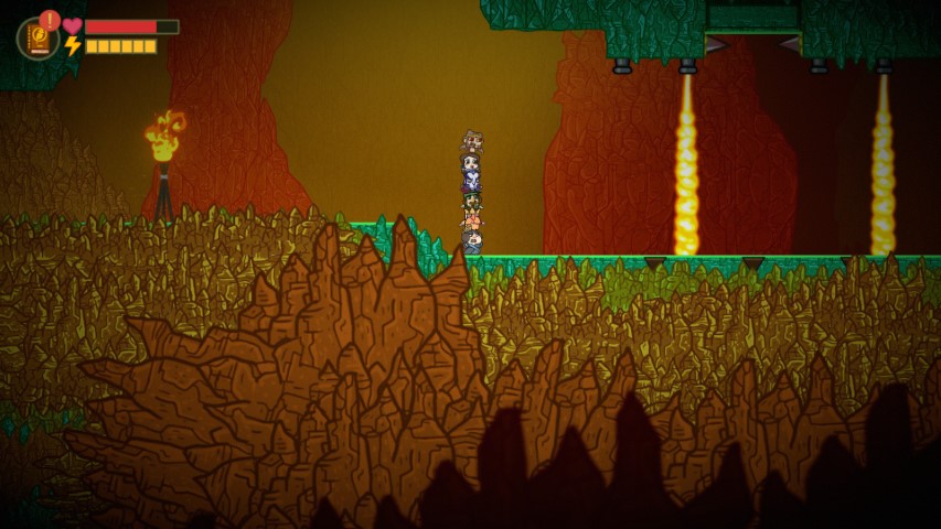 Il motivo è presto detto: capiterà di saltare, ad esempio in piattaforme contornate da spuntoni dove il minimo errore sarà punito. Non sarà mai conveniente in questi casi saltare in formazione normale ma è preferibile mettersi in colonna, uno sopra gli altri per avere una maggior precisione nei balzi. Ci piace ricordare, infatti, che Bookbound Brigade ha una fisica ben implementata. In sostanza se salteremo in formazione tradizionale in superfici sfavorevoli potremo vedere alcuni personaggi annaspare e scivolare e mettere in difficoltà gli altri che proveranno a tirarseli a sé. Ecco perché in alcuni frangenti è preferibile cambiare disposizione. Ed anche andare in colonna, ad esempio, ha le sue insidie: se si corre troppo velocemente si rischia di far cadere gli altri componenti del gruppo che poi si disporrà nuovamente in fila.