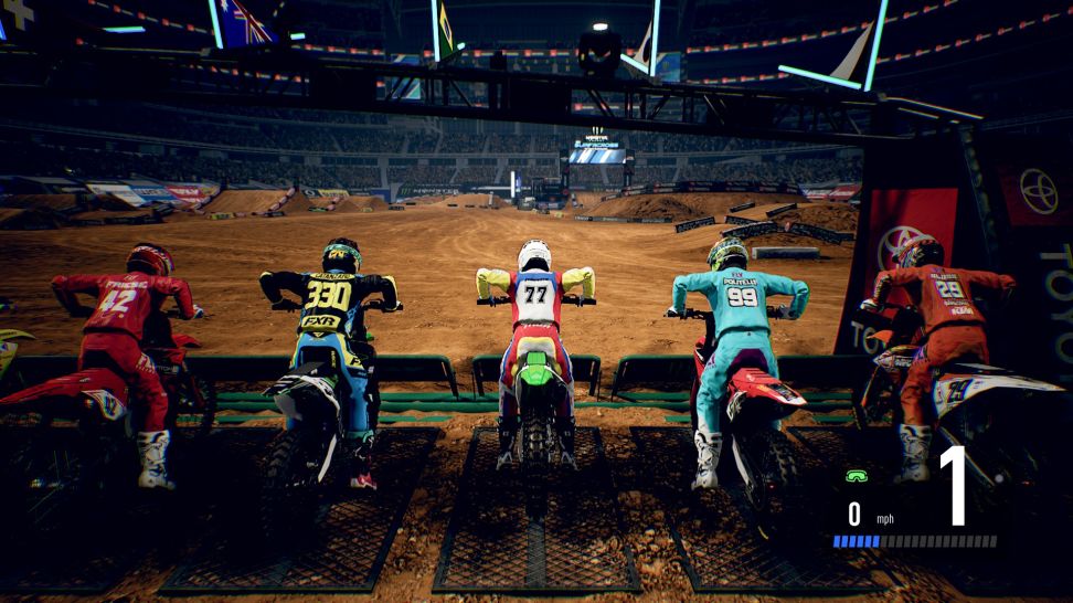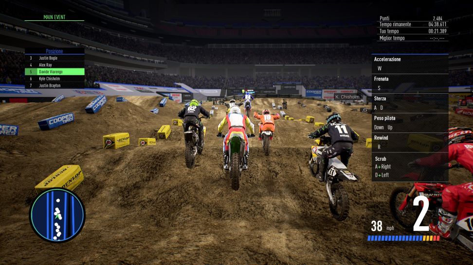 Avviandolo si viene infatti buttati in pista, né più né meno, nella cornice di una normale gara, con a sinistra dello schermo tutti i comandi da conoscere su tastiera (o pad), e in basso delle stringhe di testo responsabili dell’elargizione di consigli. L’esperienza si fa sul campo, dice il saggio, ma vista e considerata la pratica necessaria per non finire rovinosamente a terra alla prima curva, sarebbe stato più gradito un tutorial maggiormente organizzato, magari suddiviso a singole “manovre”. Ricordiamo che rispetto al tradizionale motocross, nel campionato Supercross americano le gare si svolgono prevalentemente su circuiti al coperto, siti in enormi arene, fatti di tantissime curve e dossi.