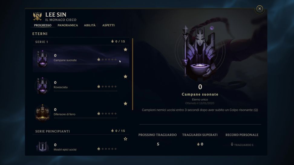 Gli Eterni hanno anche tratti unici sbloccabili, che possono essere ottenuti raggiungendo traguardi all’interno di una serie. Raggiungendo 5 traguardi in un singolo Eterno, inizierà a tenere traccia del vostro record personale per quella statistica. Superate il vostro record personale durante una partita e otterrete uno speciale annuncio per il traguardo che verrà mostrato agli altri giocatori in gioco! Inoltre, se raggiungete 15 traguardi tra i vari Eterni di un set, la vostra Emote Maestria verrà migliorata con un esclusivo effetto infuocato. È possibile migliorare l’Emote Maestria varie volte, perciò più set completerete, più bello sarà l’aspetto dell’emote di quel campione.