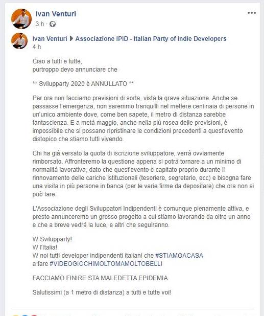 Continua il periodo no e continuano le cancellazioni di eventi a causa del Coronavirus: Svilupparty 2020 è stato ufficialmente annullato per fronteggiare l’emergenza pandemica. Ne dà notizia Ivan Venturi, uno dei veterani dell’evento dedicato alla scena indipendente nazionale che si sarebbe dovuto svolgere dal 15 al 17 maggio prossimi a Bologna.