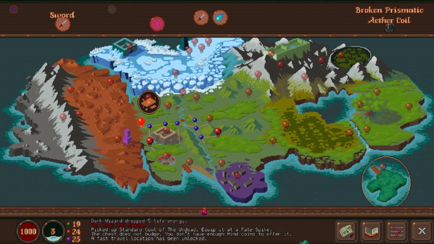 A parte la scelta dello sprite, il nostro eroe non disporrà di una scheda del personaggio. Anche l’inventario è ridotto all’osso, e consta di armi, armature, gioielli con vari bonus. Ciò che non ci ha convinto è la gestione dello stesso. In pratica, per cambiare equipaggiamento dovremo spostarci verso una delle aree principali dove tramite un cristallo, potremo modificare gli oggetti serbati nello zaino. Fin qui, tutto potrebbe anche andare bene, ma c’è un problema.