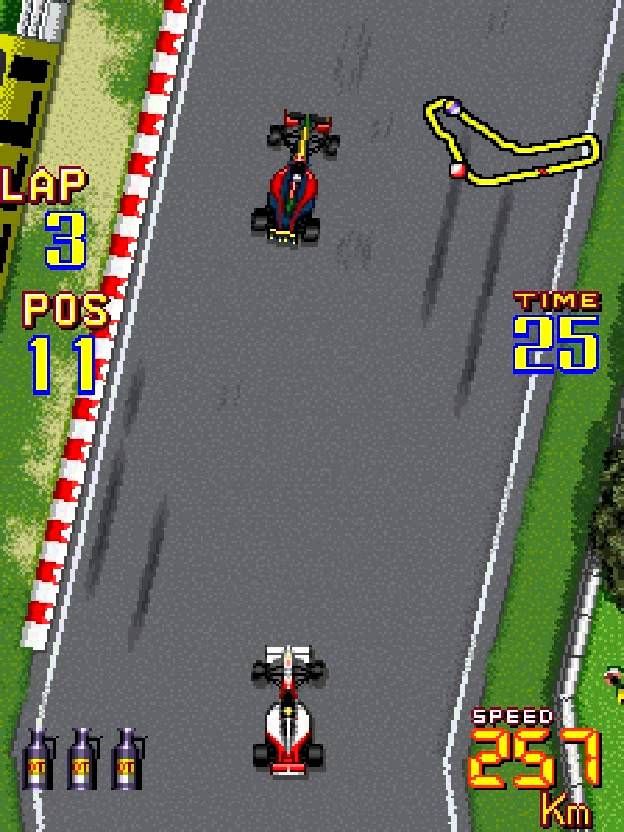 C’erano anche i tunnel da attraversare e si doveva fare attenzione anche alle pozzanghere. E c’erano anche dei rudimentali saliscendi che complicavano ancor di più il compito del giocatore dando anche un senso di realismo mai raggiunto, per ovvi motivi, prima. Visuale in terza persona dall’alto con sprite delle monoposto molto piccoli ma già più definiti rispetto al passato. Una vera e propria pietra miliare dei retro racing games arcade.