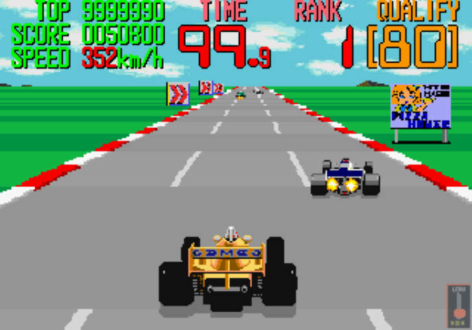 In sala giochi fu un vero successo con un cabinato che aveva la forma della monoposto, pedaliera e volante con cambio a farfalla (sullo sterzo in pratica) con possibilità anche di cambiare visuale con telecamere dall’alto, in terza persona o direttamente dal cockpit. Essendo un arcade il gameplay era piuttosto immediato ed ovviamente basato sul tempo. Ogni tracciato (ve ne erano tre) era suddiviso in segmenti e quindi si dovevano superare entro i limiti. Memorabile. Fedelissima la versione Switch uscita lo scorso anno. Uno dei retro racing games arcade più amati di sempre.