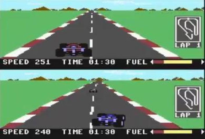 Nel sequel, uscito l’anno dopo (1984), ed intitolato quasi ovviamente Pit Stop II, la novità più grande fu l’introduzione del multigiocatore. Due utenti potevano sfidarsi in contemporanea con lo schermo condiviso orizzontalmente. Anche in modalità single player esisteva questa divisione ma nel riguardo in basso veniva mostrata una monoposto controllata dalla CPU. Tecnicamente inoltre, il gioco era decisamente più bello da vedere. Questo sequel venne pubblicato anche per Apple II, Atari 800 e Pc. Insomma, una pietra miliare che merita un posto nella storia dei retro racing games.