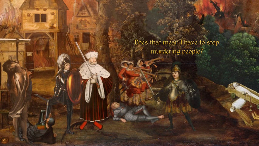 Questo è il caso del protagonista che, da spadaccino provetto e assassino genocida per hobby, si ritrova a dover riporre nel fodero la sua amata spada. I sentimenti sono decisamente contrastanti ma la parola del Papa è legge ed è costretto suo malgrado ad ubbidire.