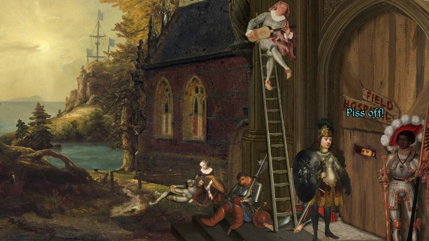 Interessante “contrasto” è vedere Cristo caduto durante il trasporto verso il Calvario, mentre in una radura vicina troviamo una folla di persone a creare un cerchio. Possiamo trovare diversi richiami alla morte sparse qua e là, come le gazze nere, i teschi di animali, la macabra ruota issata su un palo. È un quadro a suo modo “vivido e colorato” con molti paesaggi e folta vegetazione. Il gioco non è ambientato in questo contesto, ma in una serie di dipinti che gli appassionati d’arte e del periodo storico troveranno sicuramente familiari.