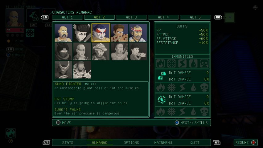 Basterà, infatti, raccogliere i cervelli che i nemici sconfitti ogni tanto faranno cadere in terra. E, previo il pagamento di una somma variabile in base al tipo di personaggio a cui vorremo accedere, aggiungeremo alla nostra collezione in decomposizione diversi eroi, ognuno dei quali possiederà statistiche, attacchi e abilità speciali completamente diversi.