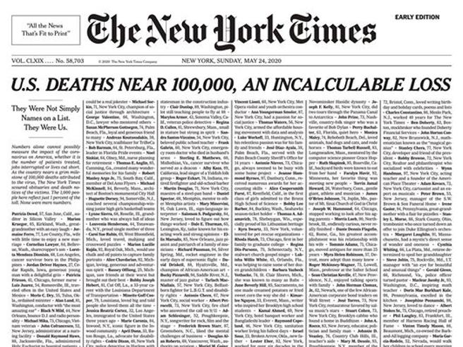 Ordunque, il New York Times ha dedicato la sua prima pagina alle quasi 100.000 vittime causate dal maledetto Covid-19 negli Usa. Come? Semplice, nel modo più “signorile” possibile, scrivendo nome e cognome, età, stato di provenienza, di ogni sfortunato ed un pensiero per ricordarlo. Anche il titolo dice tutto: “U.S. Death near 100,000, an incalculable loss” (Vittime americane vicino a 100.000, una perdita incalcolabile). Un semplice gesto, una carezza, un omaggio a chi non c’è più infischiandosene il fatto che, appunto, siano quasi 100.000 nomi da ricordare. L’articolo cita brevi storie di mille persone. Una lezione perché la ritengo tale.
