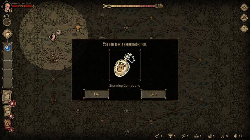 Uno dei possibili ritrovamenti durante l’esplorazione del mondo di giocoL’esplorazione ci fa andare in lungo ed in largo all’esterno del campo. La mappa è segnata da dei punti in cui potremo andare nei quali è sottolineato un evento diverso. I punti interrogativi segnano la possibilità che ci sia un evento (anche negativo) come ad esempio l’incontro con un mercante o un’imboscata o una trappola che potrebbe segnare per un numero di ore (non reali ma di gioco) determinate condizioni come, ad esempio, una penalità nei movimenti. Nella mappa sono segnati anche i dungeon (utilissimi per raccogliere tesori e risorse, ma altrettanto pericolosi) ed i combattimenti contrassegnati da una, due o tre spade. Queste rappresentano la difficoltà presunta della sfida. Ci sono anche i punti di teletrasporto che ci portano da un punto all’altro della mappa.