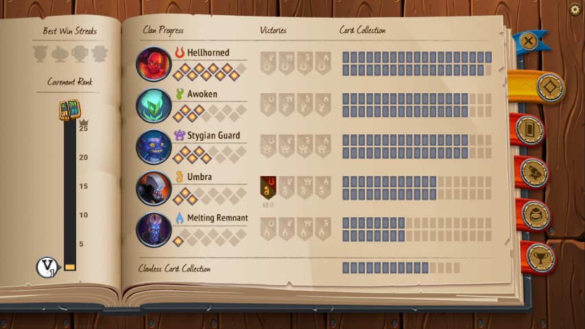 Insomma, come avete già intuito nella nostra recensione, le sfide in Monster Train non mancano. Ed è alto il fattore rigiocabilità grazie ai livelli Covenant ed alla sfida sempre più ardua che si propone. Tante meccaniche riunite e ben orchestrate. Il tutto è ben ricordato nel diario di gioco che ci mostra i livelli raggiunti dai vari clan, le vittorie, le carte sbloccate, il livello Covenant raggiunto. E ci fa da album mostrandoci le carte sbloccate.