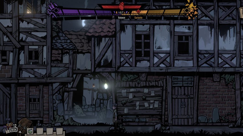 Usciti dalla nostra abitazione in cerca della madre incontreremo una cittadina dai tratti tipici medievali. Ad accoglierci una notte oscura e fredda visto il temporale che imperversa. Gli incontri non sono sicuramente amichevoli e li cominceremo anche a fare le prime scelte che andranno a modificare i nostri sentimenti e quindi le nostre reazioni. Dovremo, come già accennato, essere veloci nelle nostre risposte perché avremo il tempo limitato. Curiosità, ansia, calma, irritazione ed altre sfumature caratteriali modificheranno i nostri comportamenti e l’evolversi degli eventi. In questa sequenza lo abbiamo trovato molto simile a Darkest Dungeon.