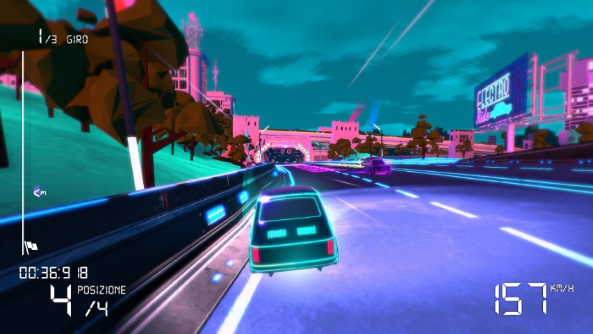 L’aspetto tecnico di Electro Ride non è niente male. Il gioco è costruito su Unity e lo sviluppatore ha dimostrato di saperlo utilizzare. La peculiarità è l’aspetto al neon del gioco ma anche alcuni dettagli. Lo stile simil low poly (e quindi con poligoni piuttosto grossi ma non così grandi come lo stile puro imporrebbe) è di effetto e ci sono anche interessanti dettagli sia paesaggistici che di ombre.