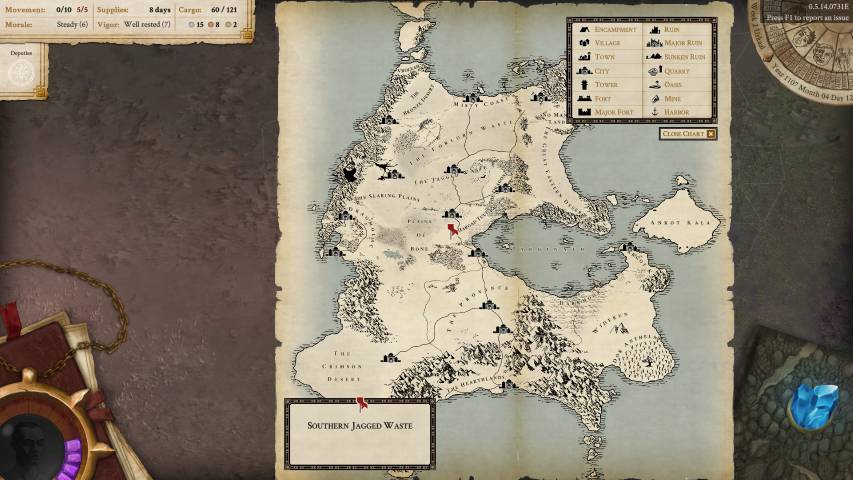 Il continente di Xeryn è veramente vasto e lo si capisce guardando la mappa del mondo ove il nostro segnalino è una piccola goccia in un mare di terra inesplorata. Il movimento si ottiene per mezzo di punti che potranno contenere al loro interno prove, quest, conflitti e dialoghi. Non potremo muoverci liberamente, ma in base ad un quantitativo di punti determinato dall’ammontare di carri e creature che li trainano. Al termine di ogni giornata di viaggi dovremo riposare e pagare i membri del nostro “comitatus”, la nostra ciurma.