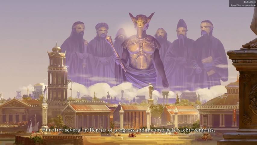 È un’epoca di scoperte, viaggi e miti. Ispiratissimo al nostro Impero Romano, eppur qualcosa è cambiato. Mille sogni, villani scienziati, uomini assetati di potere, la povertà che dileggia, il crimine che dilaga come un’onda. Gli dei hanno assistito a questo orribile spettacolo della loro creazione per eoni, ma quando il vaso trabocca d’acqua del loro sdegno, decidono di portar fine al loro silenzio.