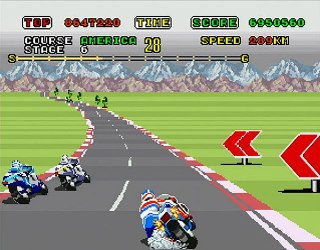 Le piste di Super Hang-on erano un sogno in Technicolor: colline sinuose, curve a gomito, pali della luce rigorosamente posti a un centimetro dal cordolo, discese e rettilinei da percorrere a folle velocità. Oltre all’aspetto tecnico e artistico, Super Hang-On offriva un gameplay strabiliante, unito alla consueta difficoltà disumana degli arcade dell’epoca.