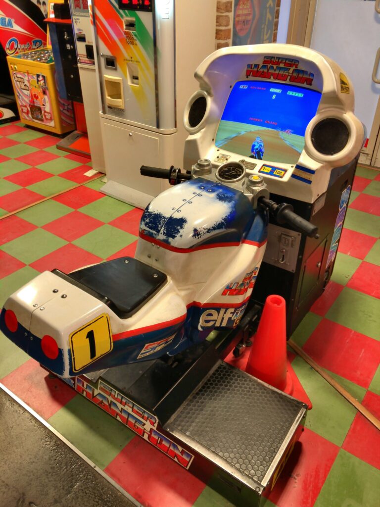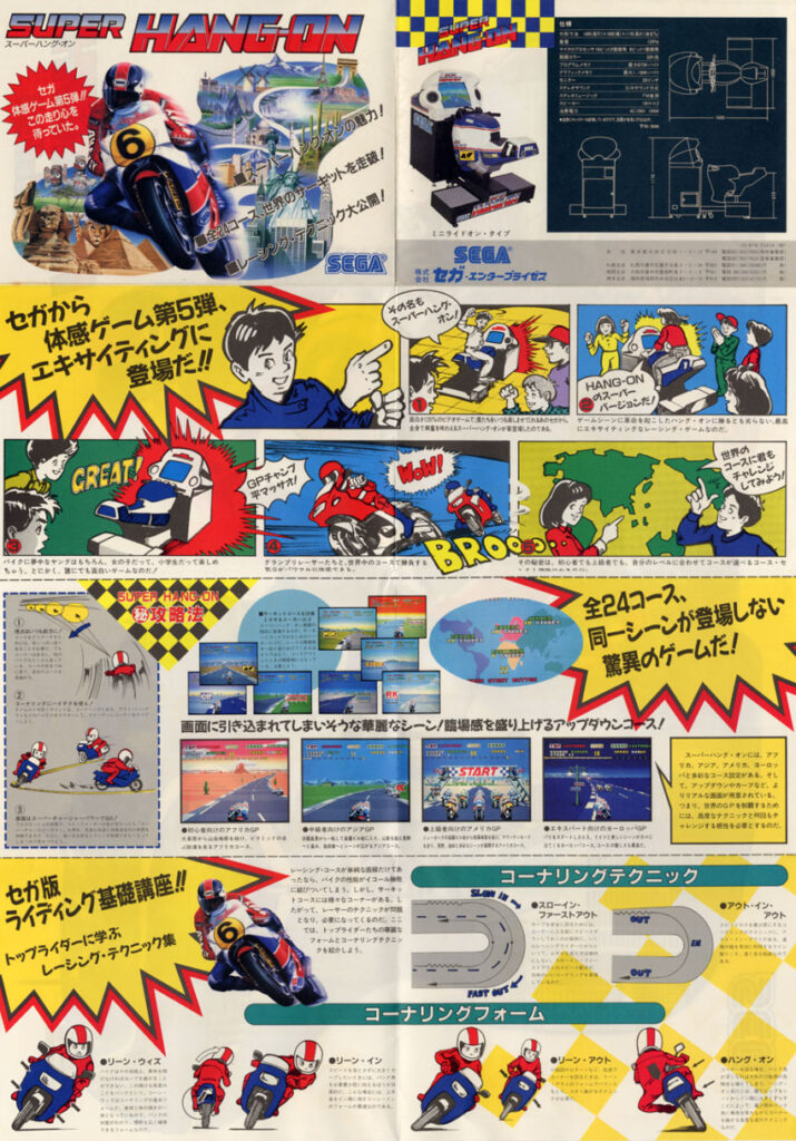 Ad allietare l’improbo compito sono presenti quattro esaltanti musiche di accompagnamento. Il gioco è caratterizzato da un umorismo molto particolare: a un certo punto, il pilota toglierà il casco presentandosi come un arzillo vecchietto con barba e pipa. Super Hang-on, pur essendo progettato con un cabinato strabiliante, era spesso disponibile in mobili generici “prontoscheda” forniti da noleggiatori senza scrupoli.