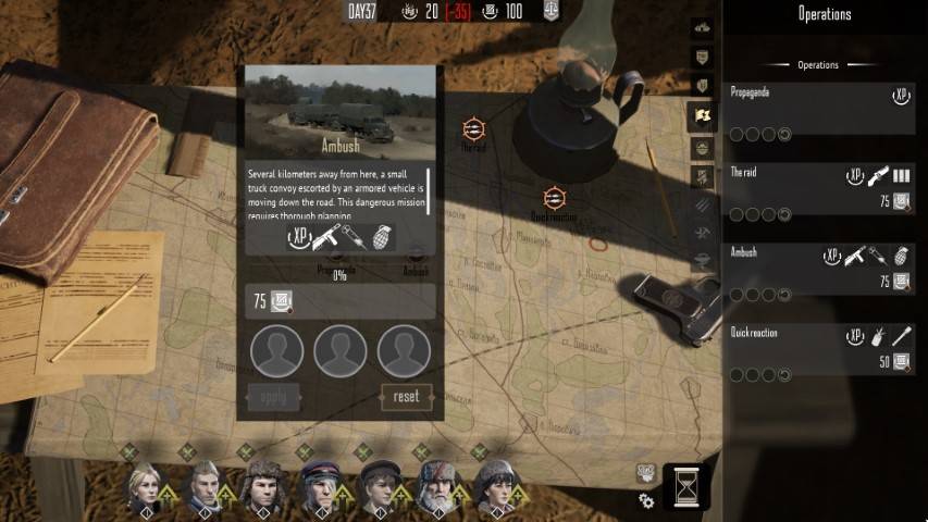 Vivete la vita di un gruppo di resistenza: sperimentate la routine di un partigiano tra una missione e l’altra. Sviluppate la vostra base, preparatevi per i prossimi incarichi, assicuratevi di avere le risorse per la sopravvivenza dei partigiani. Mantenete motivate le vostre truppe. Esplorate le regioni vicine, schermaglia per i punti deboli del nemico e opportunità di colpire il nemico.