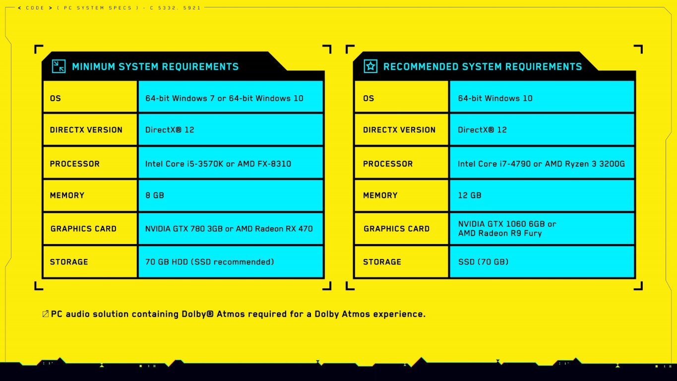 Come potete vedere, il titolo ha bisogno di almeno un Intel Core I5 3570K o di u AMD FX 8310 con 8 GB di Ram ed una Nvidia GTX 780 con 3GB di VRAM o una AMD Radeon RX 470. Ci vorranno 70 GB disponibili sull’hard disk ed è consigliata una unità SSD.