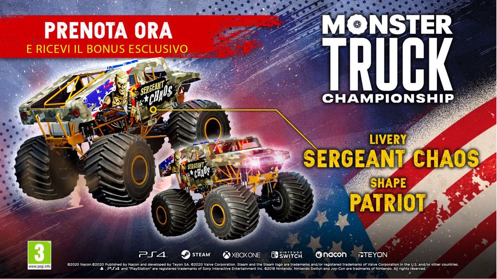 Tempo di novità per Monster Truck Championship, la nuova simulazione motoristica con protagonisti i giganti a quattro ruote svelata per la prima volta lo scorso marzo. Nacon e Teyon hanno annunciato l’edizione deluxe e il bonus pre-ordine su cui gli appassionati potranno mettere le mani. Ricordiamo che il gioco verrà rilasciato a partire dal prossimo 15 ottobre su Pc, PS4 e Xbox One. Una versione per Switch seguirà il 19 novembre.
