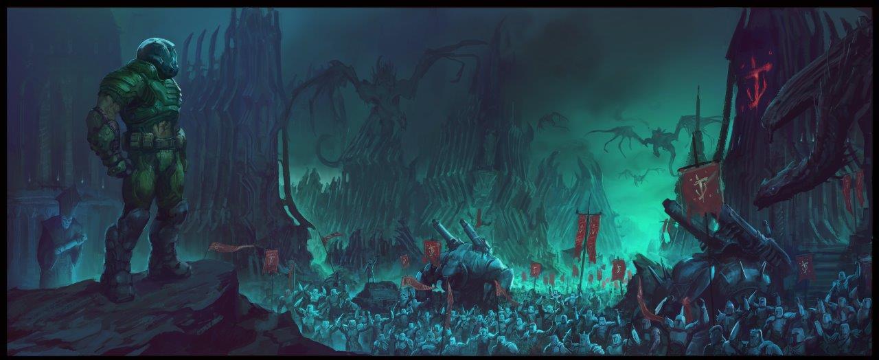Questo è stato uno dei primissimi bozzetti per Doom Eternal. Ci è servito più che altro come ispirazione per avere una rappresentazione del passato del Doom Slayer e, al tempo stesso, per espandere ulteriormente l’universo del nostro gioco. – Alex Palma