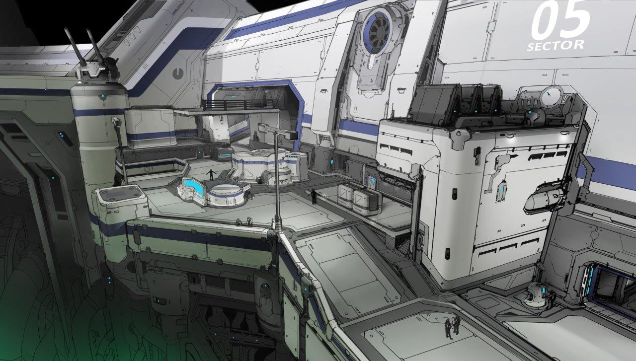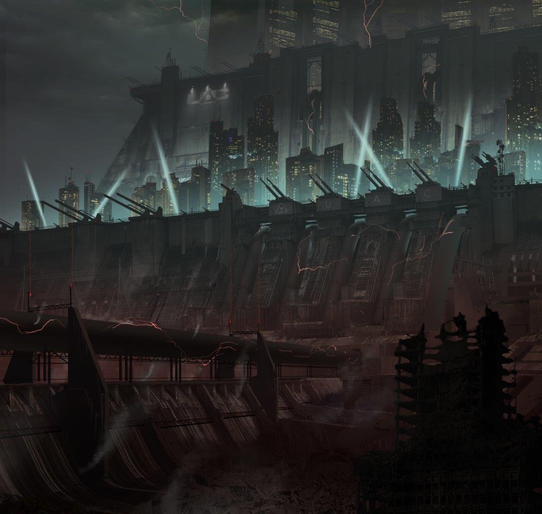 Durante le prime fasi dello sviluppo del Complesso ARC, abbiamo stabilito che la struttura dovesse essere uno degli ultimi baluardi dell’umanità sulla Terra. Qui è rappresentata in modo decisamente più maestoso rispetto alla versione finale, ma si colgono comunque i contrasti tra la parte all’interno e quella all’esterno delle mura. Lavorare sulle proporzioni, in quest’immagine, è stato molto divertente. – Colin Geller
