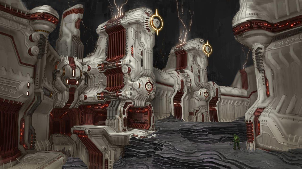 Creare l’interno del BFG 10.000 è stato uno dei miei lavori preferiti. Ho pensato di dare un’idea delle dimensioni di questo cannone utilizzando delle impalcature e dei camminamenti circondati da imponenti strutture per concentrare l’energia. La sagoma del cannone ha anche una forma concepita specificamente per assicurare la visuale migliore sullo spettacolo di fuochi d’artificio che vedrà protagonista il Doom Slayer. – Bryan Flynn