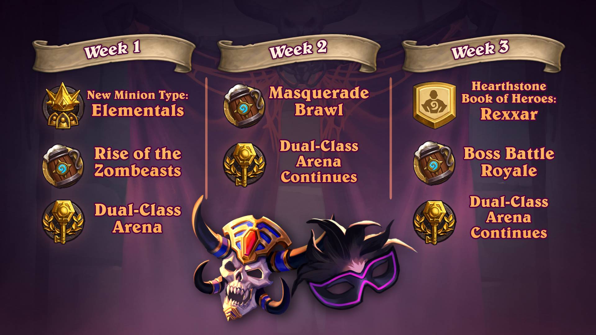 La Locanda di Hearthstone verrà sottoposta a un rinnovo totale per il Ballo in Maschera, un evento a tempo limitato con nuovi contenuti che vengono sbloccati ogni settimana. Tra questi, nuove Risse, il ritorno dell’Arena a due classi, una nuova esperienza per giocatore singolo del Libro degli Eroi e molto altro.