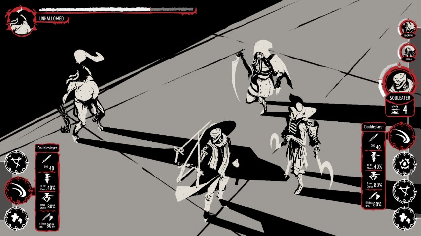 È un mix di combattimento jRPG e giochi di ruolo roguelike come Darkest Dungeon, o giochi di carte, deckbuilding, ha questo tipo di sensazione. Quindi è a turni ma con una piccola svolta nel suo sistema di turni. Combatti nemici singoli e molto potenti, uno alla volta, con un gruppo di 3 antieroi.