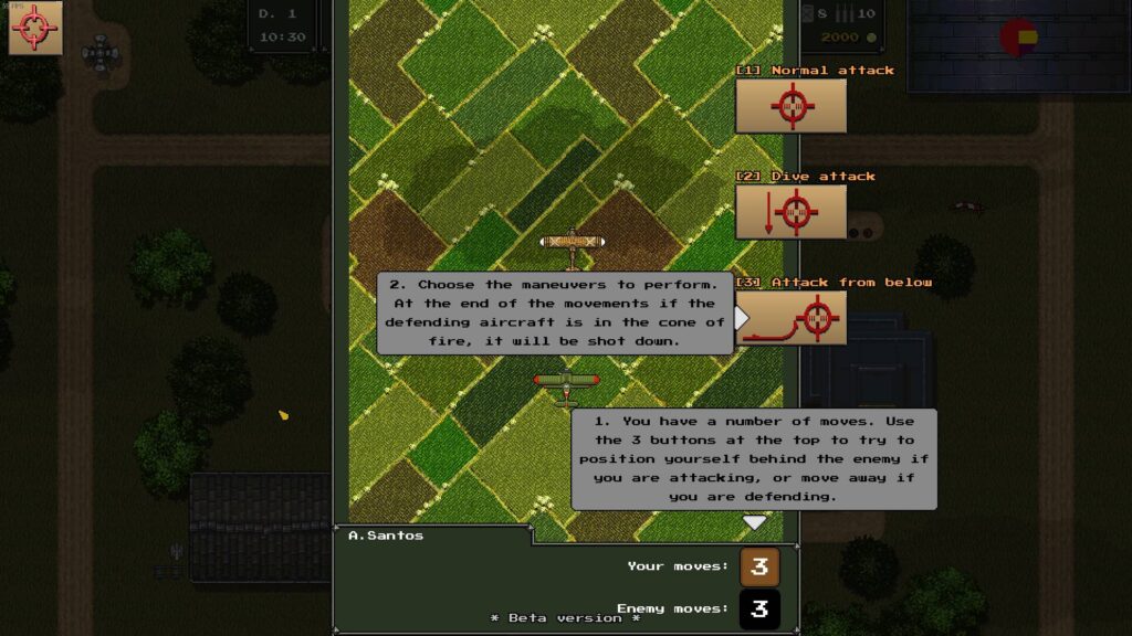 Terminata la ricognizione, verremo informati sulle missioni disponibili per quella “giornata” di combattimenti. Scorta di veicoli importanti, bombardamenti, eliminazione di bersagli strategici, duelli aerei. C’è molta varietà nei compiti da affidare ai nostri piloti e la nostra valutazione dovrà tener conto anche della forza del vento e della temperatura che andranno ad impattare anche in modo decisivo sullo stress dei piloti e sui movimenti.