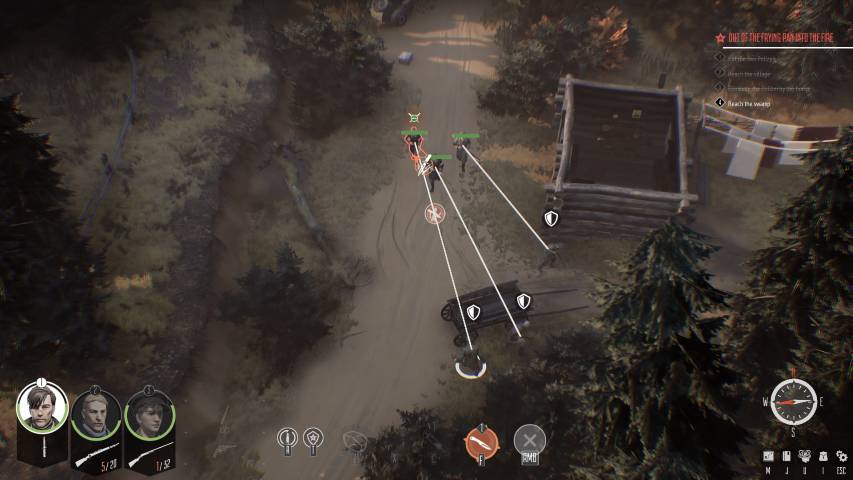 Il gameplay di Partisans 1941 è immediatamente riconoscibile. Ci si può nascondere tra i cespugli, preparare trappole, sgattaiolare dietro a muri che fungeranno anche da protezioni in caso di combattimento. Come in Shadow Tactics, Commandos e altri esponenti del genere, l’IA nemica è provvista di un campo visivo che potremo volgere a nostro favore lanciando sassi per liberarci di guardie con cui non abbiamo voglia di “interloquire”.