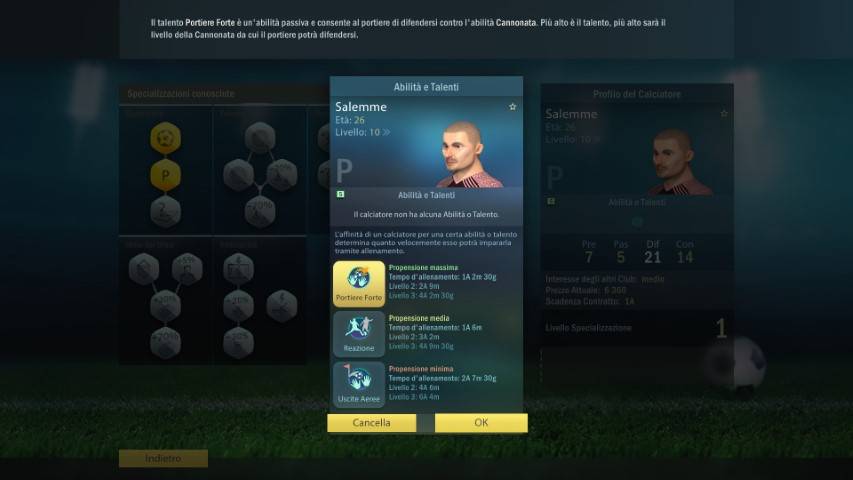 Nell’espansione questa meccanica è stata ulteriormente migliorata e dà un senso di soddisfazione enorme far si che un giocatore, magari non specializzato, migliori le sue qualità e si specializzi. Un nostro esempio va per il calciatore che nella nostra prima stagione in Eccellenza abbiamo schierato in porta in base soltanto alla sua propensione per la difesa. Non era un portiere di ruolo.