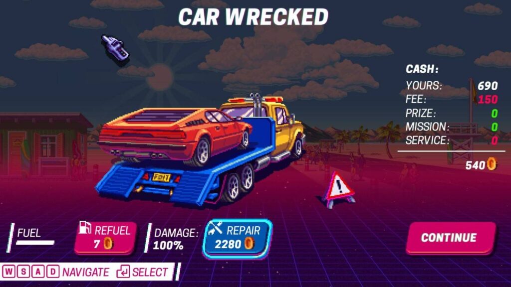 Sarà fondamentale anche tenere d’occhio il serbatoio di benzina per evitare di rimanere senza carburante. Ma no finisce qui. Capiterà spesso e volentieri di dover riparare la vettura anche parzialmente perché come nella vita reale, i soldi non basteranno mai. E l’imprevisto è sempre dietro l’angolo. Impatti, uscite di strada, tamponamenti leniranno più o meno velocemente l’integrità della nostra auto. Ovviamente, migliori saranno i parametri sulla resistenza minore saranno le conseguenze di tali impatti. Al 90% di danno la macchina comincia a fumare. Questo ricorda Continental Circuits, arcade sulla F1 della seconda metà degli anni ’80. Se ricordate in quel titolo, quando c’era un principio di incendio la monoposto cominciava a fumare e si vedevano anche le fiamme crescere. L’unica soluzione era fermarsi al box.
