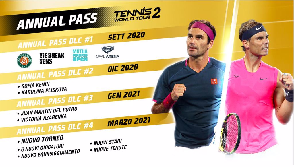 Il secondo dlc, disponibile da oggi, aggiunge invece due nuovi giocatori. Si tratta della statunitense Sofia Kenin e di Karolina Plíšková, della Repubblica Ceca. Altri due dlc usciranno a gennaio e marzo e includeranno una serie di contenuti aggiuntivi: un nuovo torneo, 8 nuovi giocatori, nuovi stadi, gironi e abbigliamento.