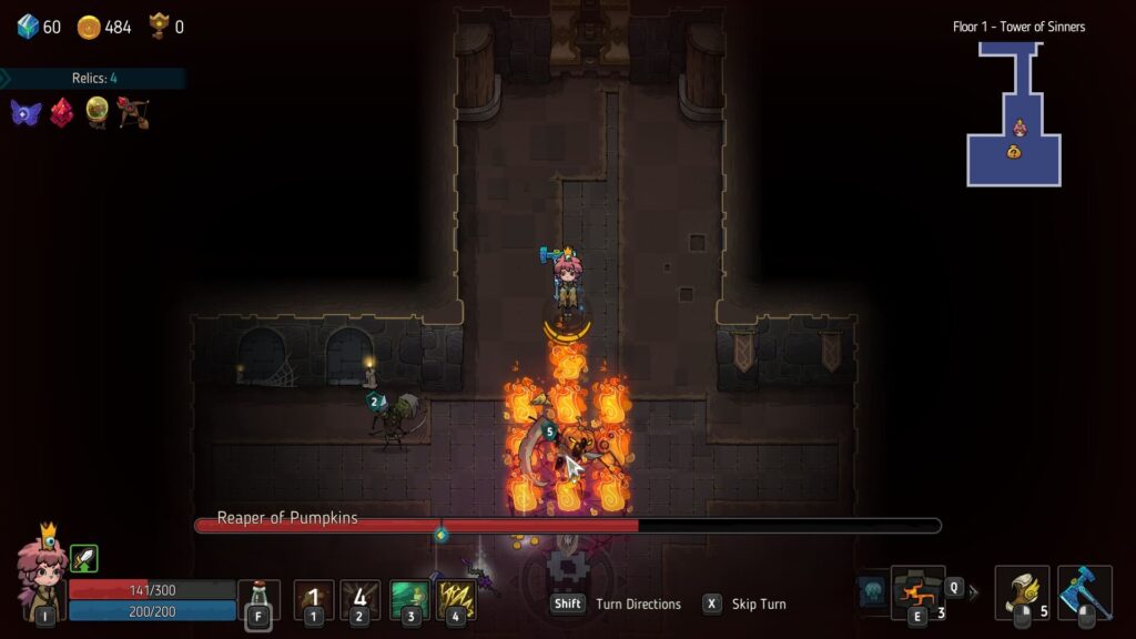 Sebbene rientri nel genere dei roguelike, Crown Trick si avvicina molto ai giochi di ruolo a turni, specialmente quelli con meccaniche tattiche. In quest’ottica, il titolo ci ha ricordato Terra Randoma (link https://www.ilvideogioco.com/2020/11/08/terra-randoma-la-nostra-anteprima/) dove il personaggio si muove in dungeon a griglia quadrate. Qui, le griglie risultano non visibili ma lo scontro con un nemico vedrà Elle e le creature muoversi dello stesso quantitativo di passi. Questa meccanica accentua in modo importante lo studio dei nemici soprattutto per quel che concerne i punti deboli. Interessante l’inserimento di armi con portata superiore a quella standard, capaci di colpire anche ad alcuni blocchi di distanza gli incubi.