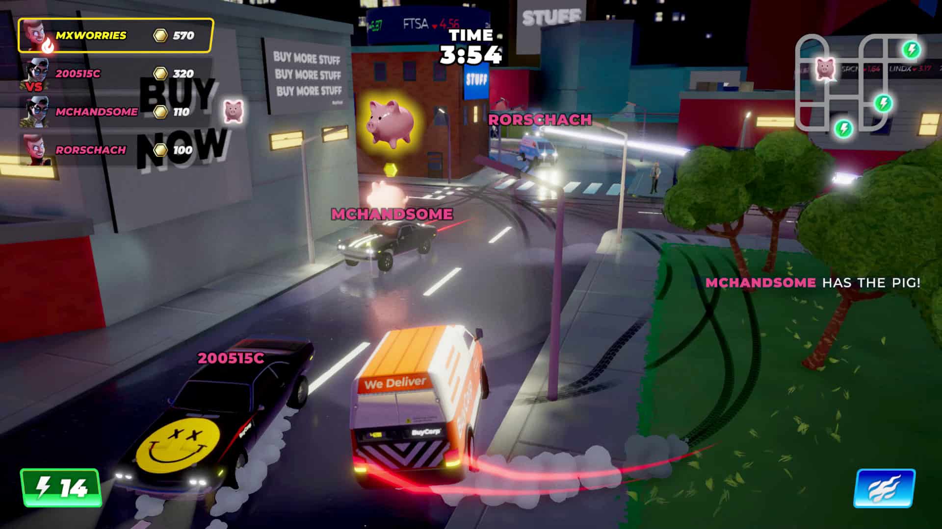 - 3 modalità di gioco: Delivery Battle (affronta il maggior numero di consegne e abbatti i conducenti rivali con i potenziamenti trovati sulla mappa. Strategico, imprevedibile e pieno di sorprese). PayDay (tieni il maggior numero di monete sulla mappa mentre schivi i potenziamenti a sinistra, a destra e al centro) Salvadanaio (tieni il maiale per guadagnare monete, altri giocatori ti danno la caccia mantenendo l’azione davvero concentrata e i giocatori serrati.
