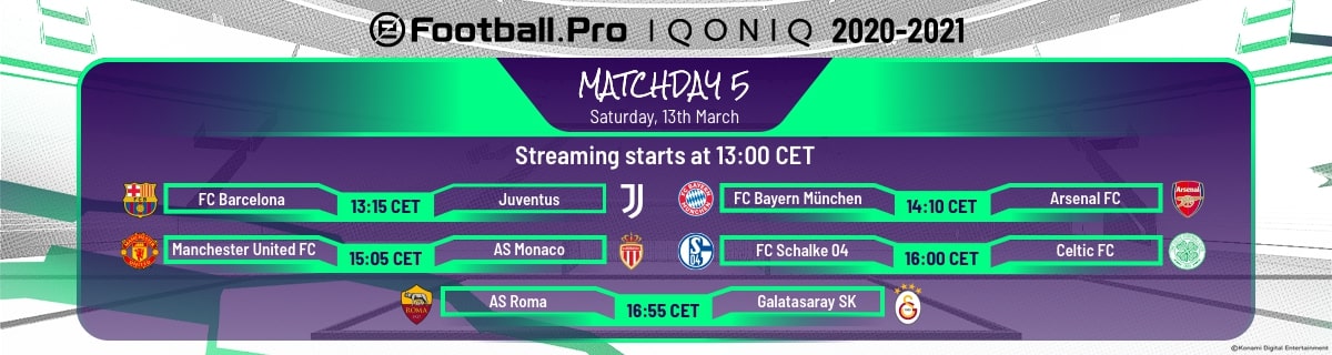 Konami ha reso noto oggi il programma delle partite della quinta giornata del campionato eFootball.Pro IQONIQ che verranno trasmesse in diretta streaming a partire dalle ore 13:00 di sabato 13 marzo.