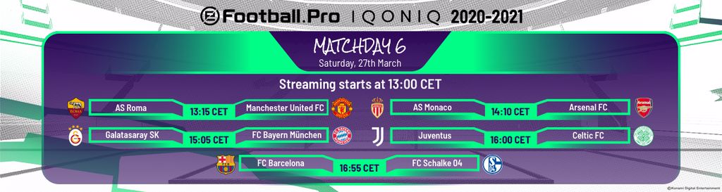 Si avvicina un altro weekend di calcio esportivo con eFootball.Pro IQONIQ. Konami Digital Entertainment ha annunciato il programma della sesta giornata del campionato. Le partite verranno trasmesse in diretta streaming (nei canali ufficiali Youtube e Facebook) a partire dalle 13 di sabato 27 marzo.