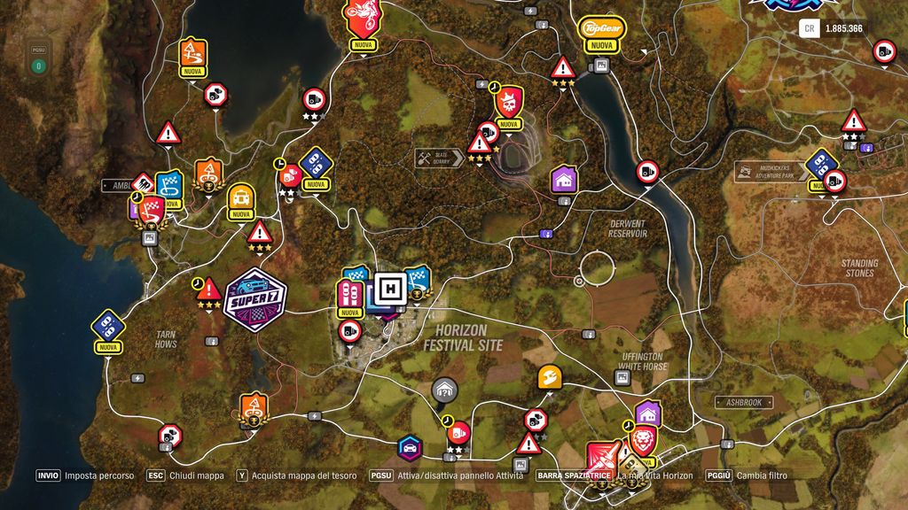 Presto la mappa diventerà così ricca di attività e punti di interesse che saremo costretti a far ricorso al “filtro”, per poter escludere ciò che non ci interessa al momentoCon più di 700 auto (di oltre 100 marchi diversi) da poter acquistare/vincere, è lecito aspettarsi una gran varietà in termini di attività. Forza Horizon 4 non delude minimamente sotto questo aspetto. Le gare si differenziano sostanzialmente in quattro tipologie. Su circuito, su sterrato, Cross Country (una variante ancora più estrema di quelle su sterrato) e corse clandestine.