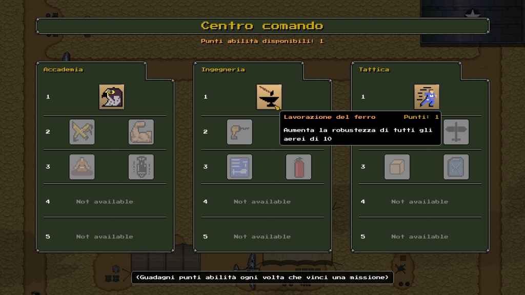 Ogni nazione presenta un set di aerei diverso e affine al periodo storico. Le missioni che intraprenderemo, permetteranno di guadagnare ricompense con le quali migliorare gli equipaggiamenti. Se lo stile visivo, completamente proposto in pixel art, può far pensare ad un gioco molto semplice si è in errore. La gestione della base presenta infatti diversi aspetti cui tener conto, cui dovremo aggiungere lo svolgimento delle missioni che presenta meccaniche proprie.