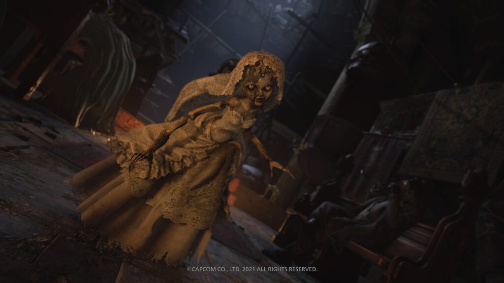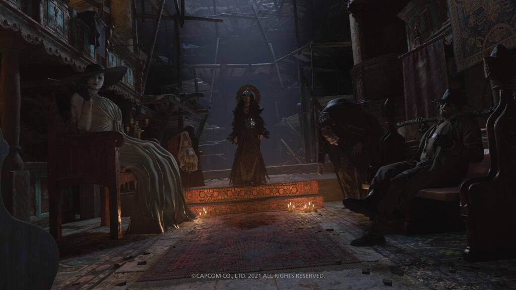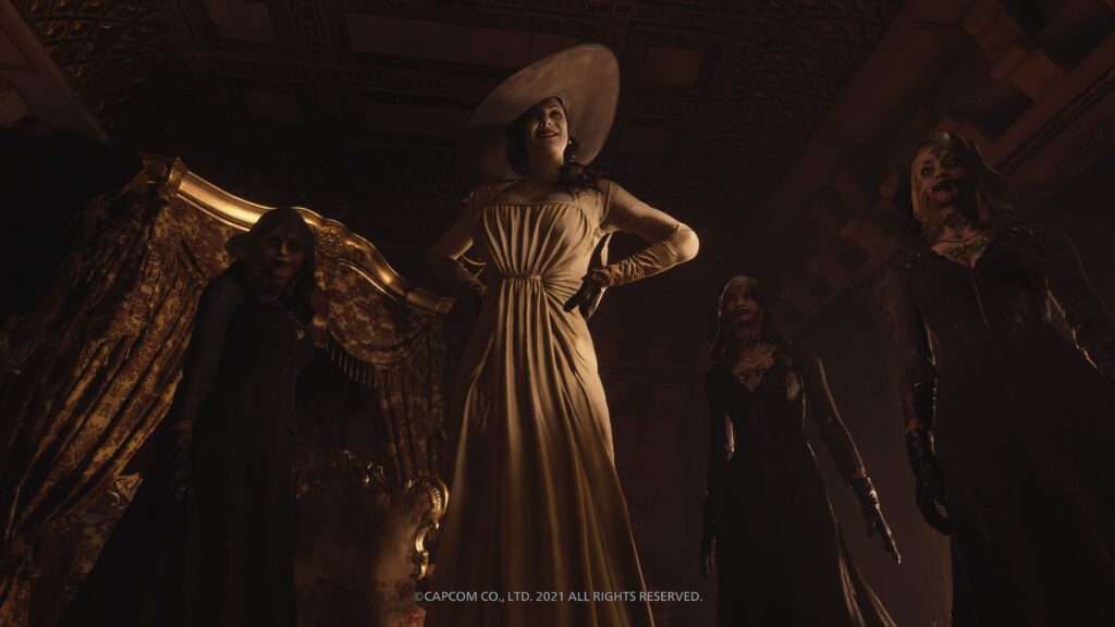 Ethan viene catturato e portato al cospetto di personaggi misteriosi e raccapriccianti. Sono i quattro lord, i padroni delle casate più importanti del villaggio. A sinistra possiamo trovare Alcina Dimitrescu e Donna Benevientu con la sua bambola Angie, mentre a destra sono presenti Moreau e Karl Heisenberg. Al centro, il leader di tutti loro, Madre Miranda.